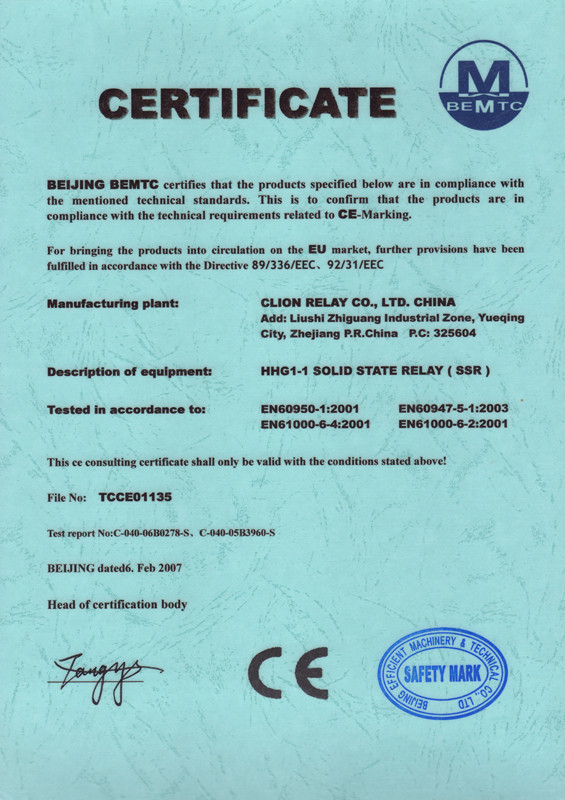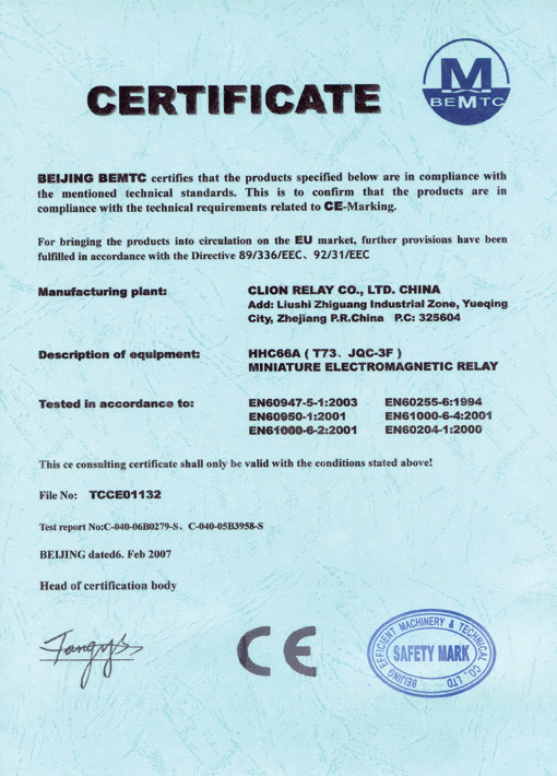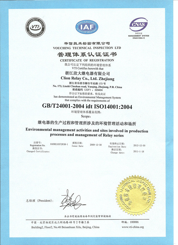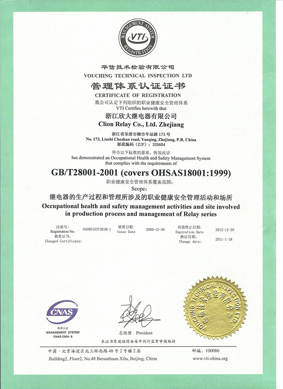 ISO9001:2000 International Quality Management System, ISO14001:2004 Environment Management System, OHSAS18001 Occupational Health and Safety Management System , RVA , CQC, 3C, CE, UL, TUV